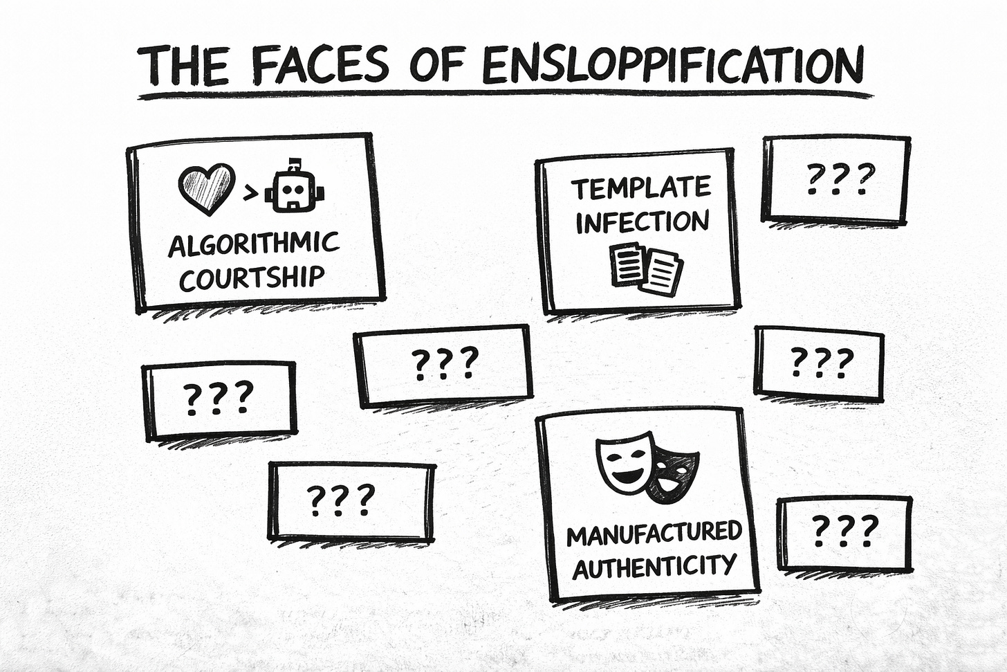 “Enshittification squeezes down, ensloppification pushes up” is the cleanest description I have seen of why everything starts to feel like the same ghostwriter with the same six templates. AI is not the root cause. It just removed the last remaining constraint: effort. Spot on.