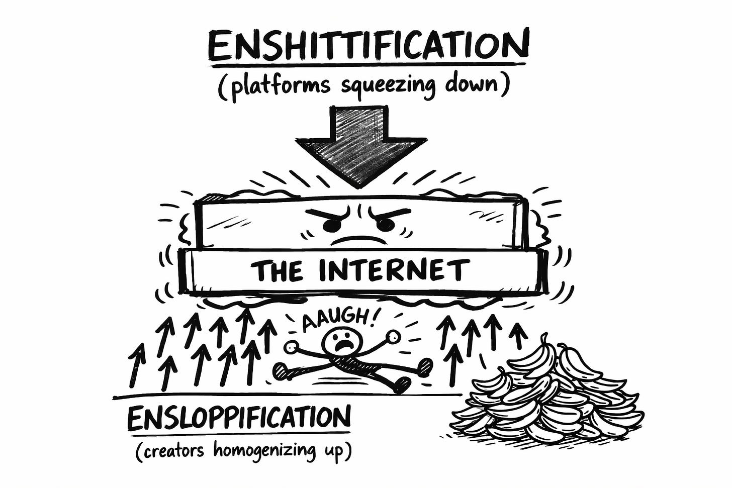 Enshittification squeezes from above. Ensloppification pushes up from below. And the internet?